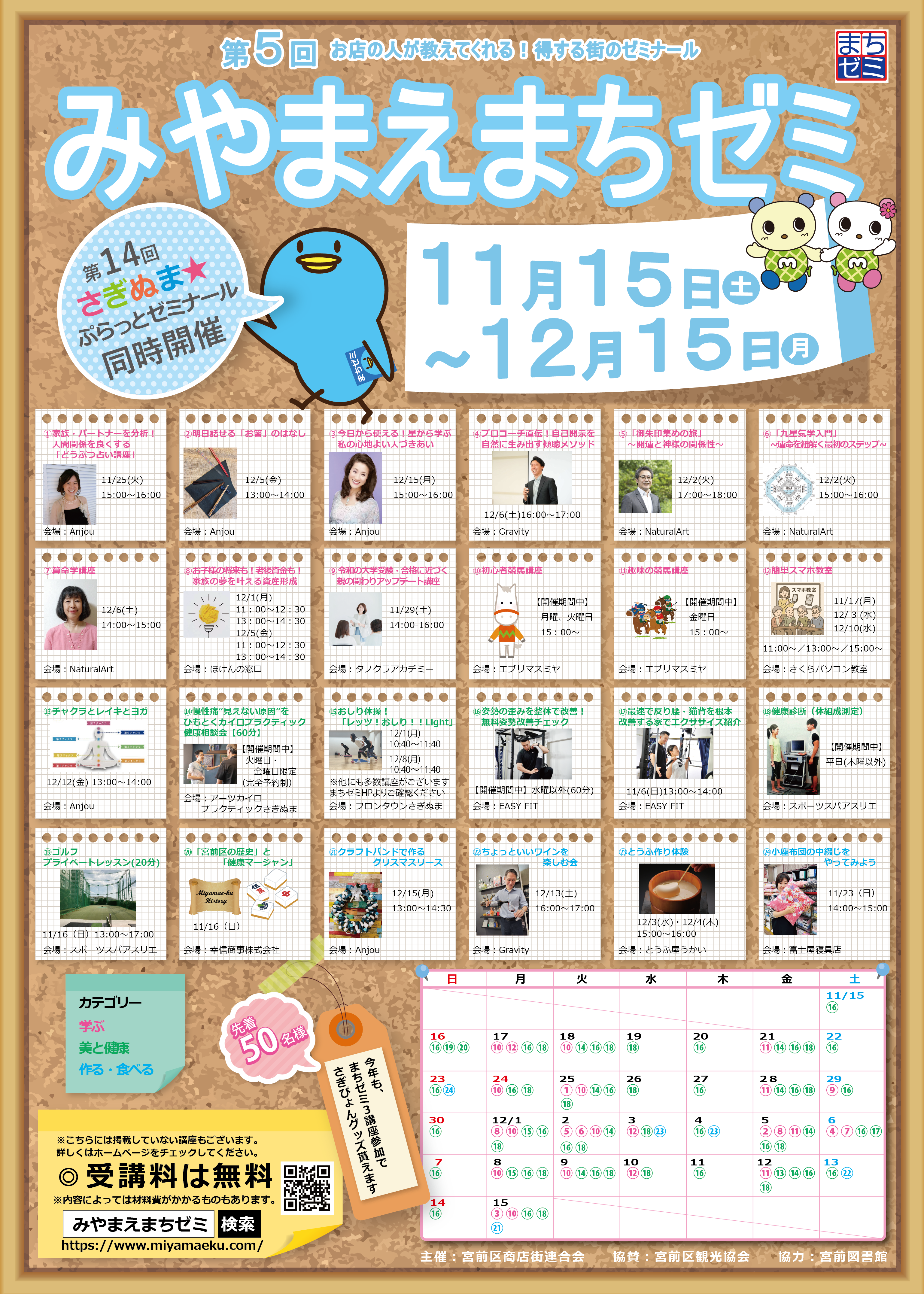 宮前区商店街連合会さま「みやまえまちゼミ」のポスターを制作させていただきました。